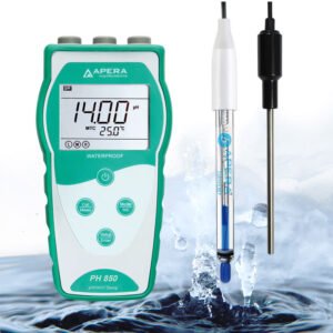 El kit de medidor de pH portátil PH400 de Apera Instruments es la opción más económica para un pHmetro portátil confiable. Equipado con una combinación de sonda/electrodo de pH 201T-S 3 en 1 de alta calidad, el medidor prueba el pH y la temperatura simultáneamente de manera rápida y precisa (Precisión: ±0,01 pH, Rango: 0 a 14 pH, 0 a 100 °C Compensación de temperatura automática o manual)