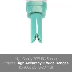 - Equipado con el Electrodo de pH/Temperatura Swiss LabSen® 803 Glass 3 en 1, diseñado para una medición rápida y estable del pH de agua pura (RO/Agua potable/Agua destilada/Agua desionizada) y soluciones de baja concentración iónica.
